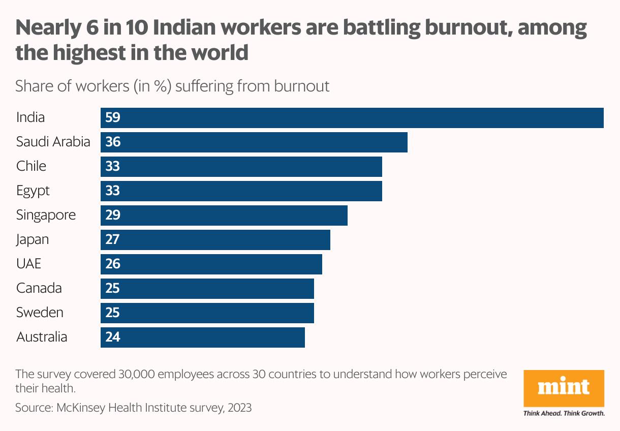 For many Indians, especially those in formal jobs, burnout has quietly become a normal part of working life. The 2023 McKinsey Health Institute report showed that 59% of Indian workers were burnt out, the highest among the 30 countries surveyed.