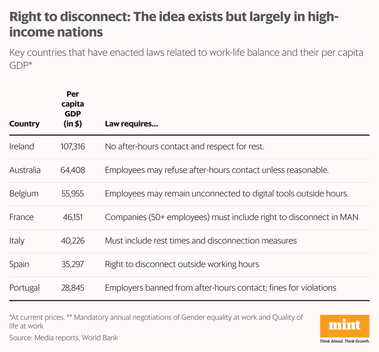 Technological innovation and digital integration has further skewed the work-life balance. While the call for Indians to work harder to has merit, this can also be done by prioritizing productivity over the number of hours worked or availability after work hours. While workers in many low- and middle-income economies work long hours with low productivity, laws mandating the right to disconnect are limited to a handful of high-income countries.