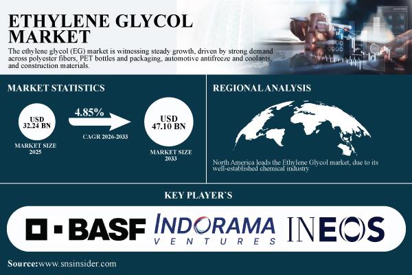 (MENAFN- GlobeNewsWire - Nasdaq) Ethylene Glycol Market growth is witnessing steady growth, driven by strong demand across PET bottles and packaging, and automotive antifreeze and coolants.Austin, Dec. 13, 2025 (GLOBE NEWSWIRE) -- According to SNS Insider, The Ethylene Glycol Market size is estimated at USD 32.24 Billion in 2025 and is expected to reach USD 47.10 Billion by 2033, growing at a CAGR of 4.85% during 2026–2033. Increasing industrialization, expanding textile and packaging sectors, and rising demand for sustainable materials are fueling market expansion.