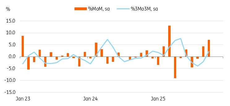 It's still unclear whether recent tensions between China and Japan are affecting trade. Exports to China declined (-2.4%) across most categories, except for electrical machinery. Significant declines were seen in organic chemicals (-23.6%) and nonferrous metals (-26.8%). But these exports have been sluggish throughout the year, partly due to unfavourable price effects and global oversupply. Regarding imports, raw material imports rose by 1.8%; imports of chemicals and machinery also remained positive. However, starting in December, we should monitor how geopolitical tensions may begin to affect trade between the two countries.