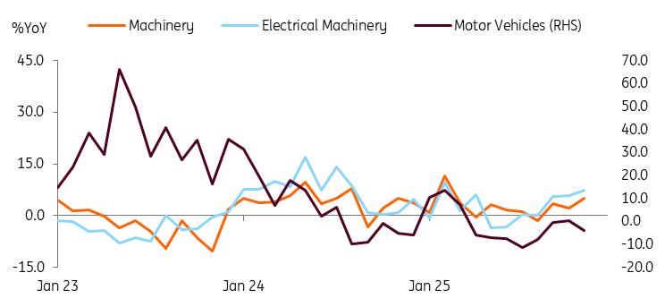 By export item, machinery exports increased by 5.1% and electrical machinery by 7.4%. Semiconductor exports rose 13%, mirroring growth seen in other major Asian chipmakers. Semiconductor exports throughout Asia remained robust. Motor vehicle exports fell by 4.1%. Yet shipments to the US increased slightly (1.5%), while exports to the EU remained strong (25.7%).