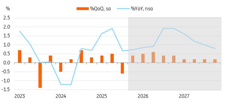 Recent releases of industrial production, retail sales, trade figures, and survey results reinforce our expectation that growth will recover in the fourth quarter of 2025. We anticipate a 0.4% quarter-on-quarter increase for 4Q25, with full-year GDP projected to rise by 1.2% YoY in 2025 and 1.4% in 2026.