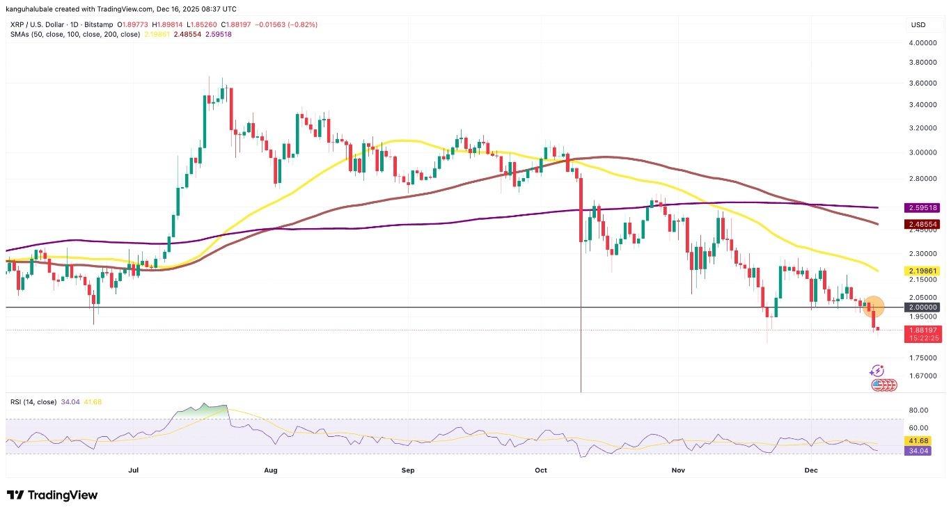 (MENAFN- Daily Forex) The XRP/USD pair is down 7% over the last 24 hours, sliding below the $2 mark to trade at $1.88 at the time of writing on Tuesday, Dec. 16.XRP/USD daily chart. Source: TradingViewThe moving averages have started to turn down, and the RSI is in the negative territory, indicating bears are in control BTC Miners Shut Down in XinjiangOn Monday, December 15, reports emerged of a renewed crackdown by the Chinese Communist Party (CCP) on underground Bitcoin mining in Xinjiang, resulting in the shutdown of approximately 1.3–2 GW of power capacity.This affected 400,000–500,000 mining rigs, removing roughly 100 EH/s (8–10%) from Bitcoin's global hashrate-the sharpest drop since the 2024 halving.The event triggered short-term bearish sentiment. Miners facing abrupt closures may liquidate BTC holdings to cover costs, while fears of displaced capacity flooding secondary markets added selling pressure. Combined with high leverage in derivatives and Asia-session weakness, this contributed to millions in crypto liquidation.In the last 24 hours, Bitcoin fell approximately 4.5%, declining from above $90,000 to around $85,500. The broader market followed, with Ethereum dropping 6.7%, to trade below $3,000.XRP, which operates on a non-PoW consensus mechanism and is unaffected by mining disruptions, declined similarly by 7%, losing the key support level at $2.Its performance reflected high correlation with Bitcoin during risk-off events, amplified by overall market contagion rather than direct exposure to the Xinjiang shutdowns. No Ripple-specific news drove outsized moves; XRP tracked the sector's downside amid renewed regulatory fears from China Liquidations Hit $660 MillionAround 190,323 traders have been liquidated to the tune of more than $658 million over the past 24 hours as major cryptocurrencies lost key support levels, slashing their gains after news emerged that mining farms are shutting down in China's Xinjiang autonomous region.The majority of liquidations were long positions, according to CoinGlass, which came as XRP price dropped to $1.88 on Bitstamp, its lowest price since November 21.Over $582.6 million in long positions were liquidated, with Ethereum (ETH) accounting for $207 million of that total as it dropped 6% to $2,934, followed by Bitcoin with $170 million in long liquidations. XRP accounted for $15.54 million in long liquidations.Crypto liquidations across all exchanges. Source: CoinGlassMore than $658.4 million in both long and short positions were liquidated across the crypto market.The XRP liquidation heatmap showed the price eating away liquidity below $2, with more than $450 million bid orders sitting between $1.87 and $1.85.XRP liquidation heatmap. Source: CoinGlassA break below $1.85 could see the price drop to grab liquidity, sitting down to the $1.80 level Price Must Hold $1.85 to Avoid Deeper CorrectionXRP is down more than 10% from Sunday's high of $2.03 to today's intraday low of $1.85.This drop saw XRP price lose the key levels: The psychological level at $2 and the 100-week exponential moving average (SMA) at $1.87. The 97% uptick in daily trading volume to $3.86 billion reinforces the intensity of the sell-side pressure as traders turned bearish.A key area of interest lies within the $1.85 (today's low) and $1.80 (the November 21 low), which, if lost, would trigger another cascade of long liquidations, with local lows at $1.61 being the next area of interest.Below that, the 200-day EMA $1.38 could be a safe haven for the bulls, where they could take a breather and regroup before making another attempt at recovery.XRP/USD weekly chart. Source: TradingViewMeanwhile, the Crypto Fear and Greed index has now slipped into the“extreme fear” zone, an area it has held since mid-November, suggesting that the market conditions still favour the downside.Crypto fear and greed index. Source: AlternativeDecember is typically a bearish month for XRP, according to data from Crypt Rank, and with the current market drawdown, fears are rising that what has long been known as an 'Santa Rally' could bring losses for crypto investors even as the Holiday Season draws near.Ready to trade our analysis of Ripple? Here's our list of the best MT4 crypto brokers worth checking out.