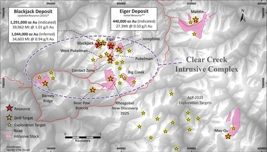 The RC Project covers 11 Mid-Cretaceus intermediate intrusions hosting significant Reduced Intrusion-Related gold style (RIRGS) mineralization with several target areas returning greater than 100 g*m (g/t gold x metres) intersections from initial drilling. The Blackjack and Eiger are the two most advanced deposits with existing mineral resource estimates ( 1,291,000 ounces of gold in 39,962,000 tonnes grading 1.01 g/t gold in an indicated category and 1,044,000 ounces of gold in 34,603,000 tonnes grading 0.94 g/t gold in an inferred category at Blackjack and 440,000 ounces of gold in 27,362,000 tonnes grading 0.50 g/t gold in an inferred category at Eiger). Deep drilling at Blackjack (Hole 076 intersected 65.0 m of 2.00 g/t gold from 806.0 metres, which includes two higher grade intervals of 8.0 m of 4.80 g/t gold and 6.26 m of 5.53 g/t gold; see press release dated June 11, 2025, and 164.8 metres of 0.82 g/t gold starting 9 metres from surface, including 119.0 metres of 1.05 g/t gold, 37.9 metres of 2.05 g/t gold and 11.5 metres of 4.32 g/t gold; see news release dated November 25, 2025) intersected higher grade mineralization at depth highlighting the potential for underground resources at Blackjack. Drilling at Rhosgobel outlined a 1.1 km wide zone of RIRGS style mineralization down to a depth of over 400 m. The best results to date at Rhosgobel were hole DDRCRG-25-010 which intersected 235.9 m of 1.11 g/t gold, including 40.0 m of 2.01 g/t gold and 10.0 m of 5.29 g/t gold, from the surface (see news release dated September 18, 2025). Drilling at Contact returned impressive results with up to 119.0 metres of 1.01 g/t gold returned from surface, including 10.7 m of 4.1 g/t gold and 1.2 metres of 24.8 g/t gold, confirming significant gold mineralization at the Contact Zone (see news release dated November 12, 2025).