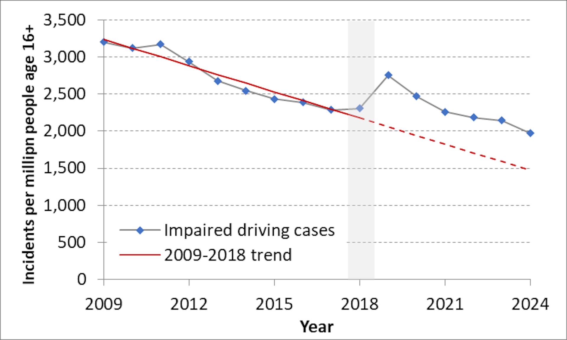 But in 2019, rates jumped substantially. As a result, police reported 31 per cent more impairment cases during 2019-23 than the 2009-18 trend had projected.