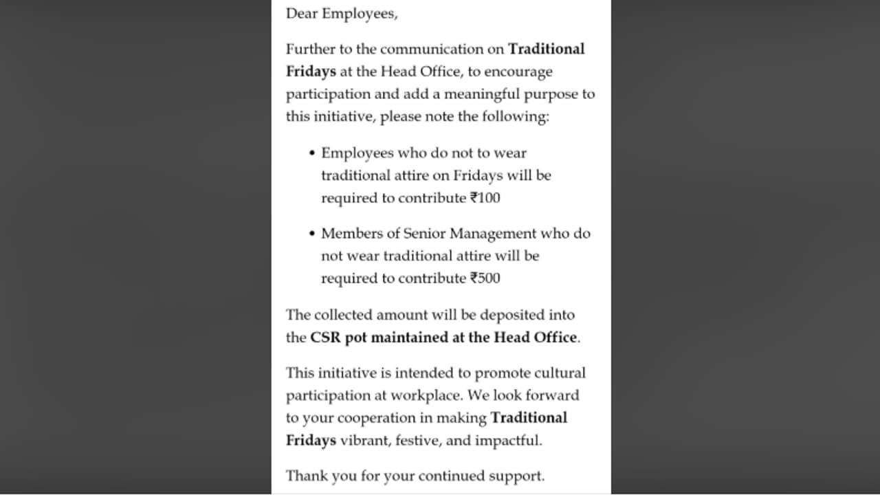 The original poster shared that their company had initially allowed casual Fridays for the first six months of their employment. However, the policy was recently changed to require“formal/traditional” attire on Fridays. While colleagues generally complied, the poster acknowledged they personally didn't own simple Indian ethnic wear and saw no practical reason to invest in it. When HR circulated an email enforcing the new dress code, the employee responded with a mix of exasperation and humour, joking about turning up in a lehenga to make a point.