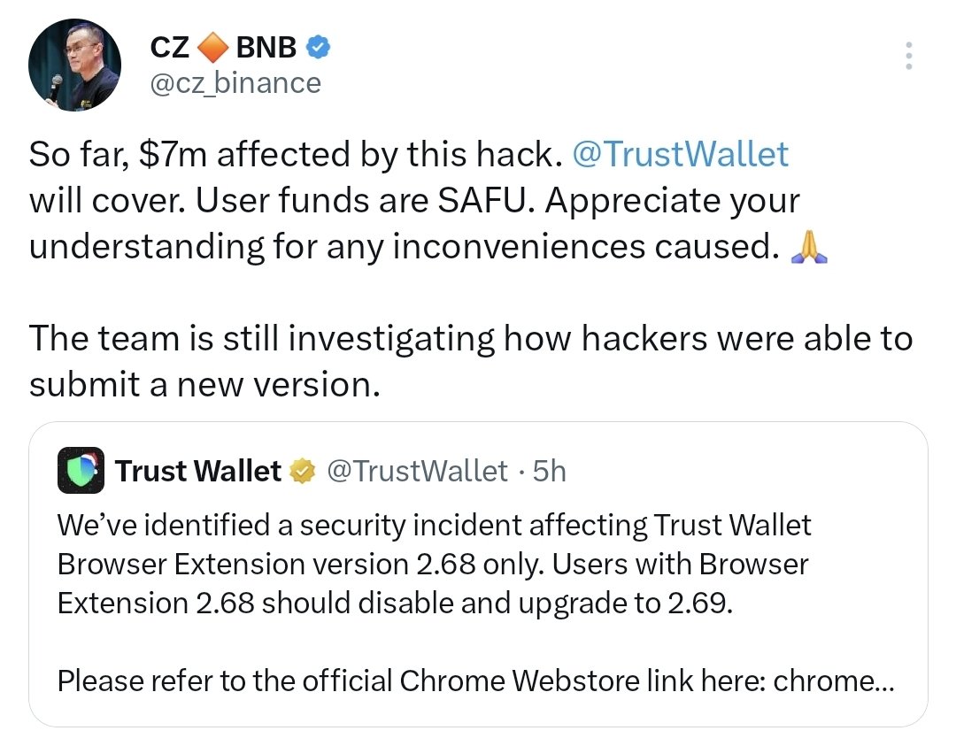 Changpeng Zhao, co-founder of Binance, which owns Trust Wallet, confirmed the breach and said affected users would be reimbursed. Zhao stated that internal reviews showed the losses stemmed from the fraudulent extension rather than vulnerabilities in Trust Wallet's core infrastructure. He added that the company had begun compensating victims while coordinating with browser security teams to prevent similar incidents.