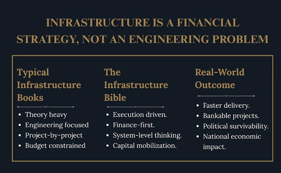 Unlike conventional infrastructure literature often dominated by engineering theory or project-by-project case studies - The Infrastructure Bible is written explicitly for ministers and senior government leaders responsible for delivering results under pressure.