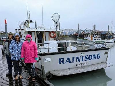 "Three people in rain gear stand on a wet dock alongside the Rainisong charter boat in the harbor of Seward, Alaska."Seward Fishing Club offers expert-guided salmon fishing charters from Seward Harbor, Alaska, with Captain Johnny leading beginner-friendly trips that include professional fish cleaning services and dedicated support.
