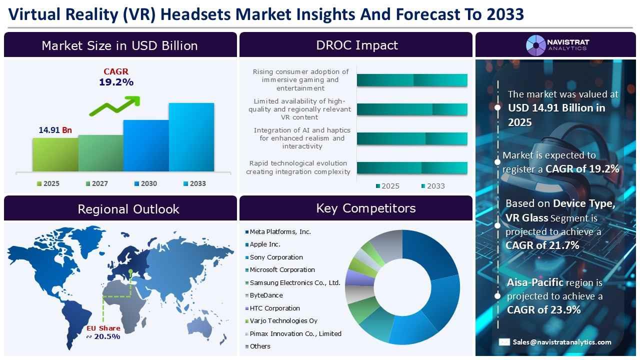 Virtual Reality (VR) Headsets Market is USD 14.91 Billion in 2025 and is projected to register a CAGR of 19.2%
