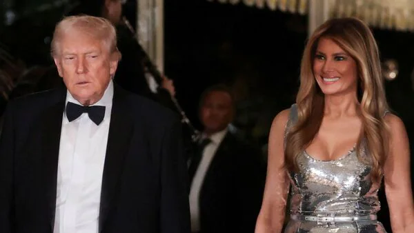 Wearing a tuxedo, Trump posed outside the ballroom with Melania, who stood out in a shimmering silver full-length gown, before the couple entered the New Year's Eve bash at the estate.