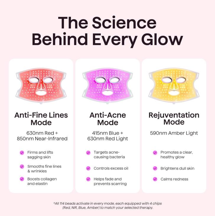 Rejuvenation Mode (Amber 590nm): Perfect for post-sun care or revitalizing tired skin, this mode brightens dullness and helps even out skin tone.