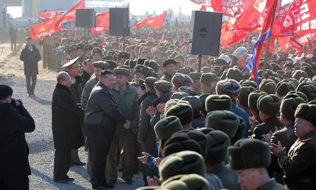 In a speech, Kim praised the builders for working hard "to transform the island area, once severely hit by natural disaster, into an ideal greenhouse town symbolic of the new era in more than 500 days," according to the KCNA.