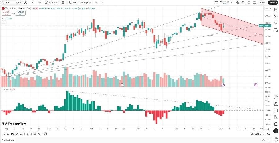 (MENAFN- Daily Forex) Short Trade IdeaEnter your short position between $444.57 (yesterday's intra-day low) and $457.55 (yesterday's intra-day high).Market Index Analysis Tesla (TSLA) is a member of the NASDAQ 100, the S&P 100, and the S&P 500. The NASDAQ 100 Index rallied to start the trading week and remains within touching distance of recent highs, though technical momentum indicators show signs of fatigue with bearish divergence in the RSI and extreme overbought conditions in the Stochastic Oscillator, suggesting a pullback may be overdue. The Bull Bear Power Indicator of the NASDAQ 100 turned bullish but remains vulnerable given the compressed technical setup, rising valuations, and widening spread between index leaders (mega-cap AI names) and struggling contributors like Tesla.