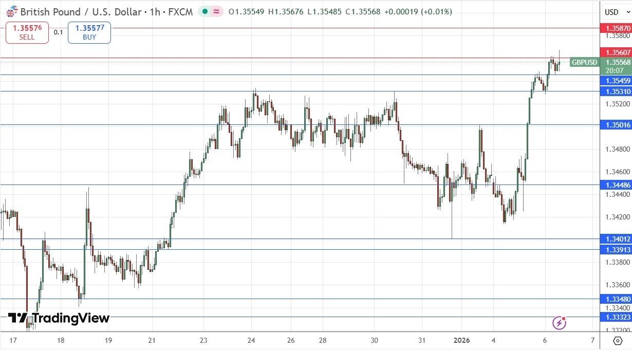 EURUSD Chart by TradingViewGBP/USD AnalysisI wrote in my previous GBP/USD forecast on Monday last week that trades from reversals at either $1.3473 or $1.3534 would make sense, due to the prevailing range being likely to hold. This was an accurate and profitable call.GBP/USD is trading now just above $1.35, with intraday ranges stretching roughly between $1.3520 and $1.3560, as the pair benefits from a softer US Dollar and improving risk sentiment. Dollar weakness is linked to a retreat in the US Dollar Index and growing expectations that the Fed will move closer to an easing cycle later in 2026, which is weighing on the greenback across the majors.Risk sentiment has improved notably, with global equities holding firm and FX market updates highlighting growing risk appetite and pressure on the safe-haven Dollar, which is helping GBP/USD grind higher.The price action is printing a sequence of higher lows on the intraday charts, reinforcing the bullish bias and suggesting dip-buyers are increasingly willing to step in above former resistance levels.Technically, the pair has overcome the big round number at $1.3500 and is now trading solidly above it – a classic bullish sign in trend continuation setups. The resistance level at $1.3561 stands out as today's pivotal point; a sustained break above here would likely open the door toward the higher resistance at $1.3587 which could then trigger a fast rise all the way to the next resistance level at $1.3656.Given the improving risk tone, weakening Dollar, and constructive technical structure above $1.3500, my directional bias is bullish. A long trade entry could be a good idea if we get two consecutive higher H1 closes above $1.3561, or even better, above $1.3587, provided there are no significant upper wicks on either candlestick.There is nothing of high importance scheduled today regarding either the GBP or the USD.Ready to trade our daily Forex signals? Here is our list of the top 100 Forex brokers list worth reviewing.