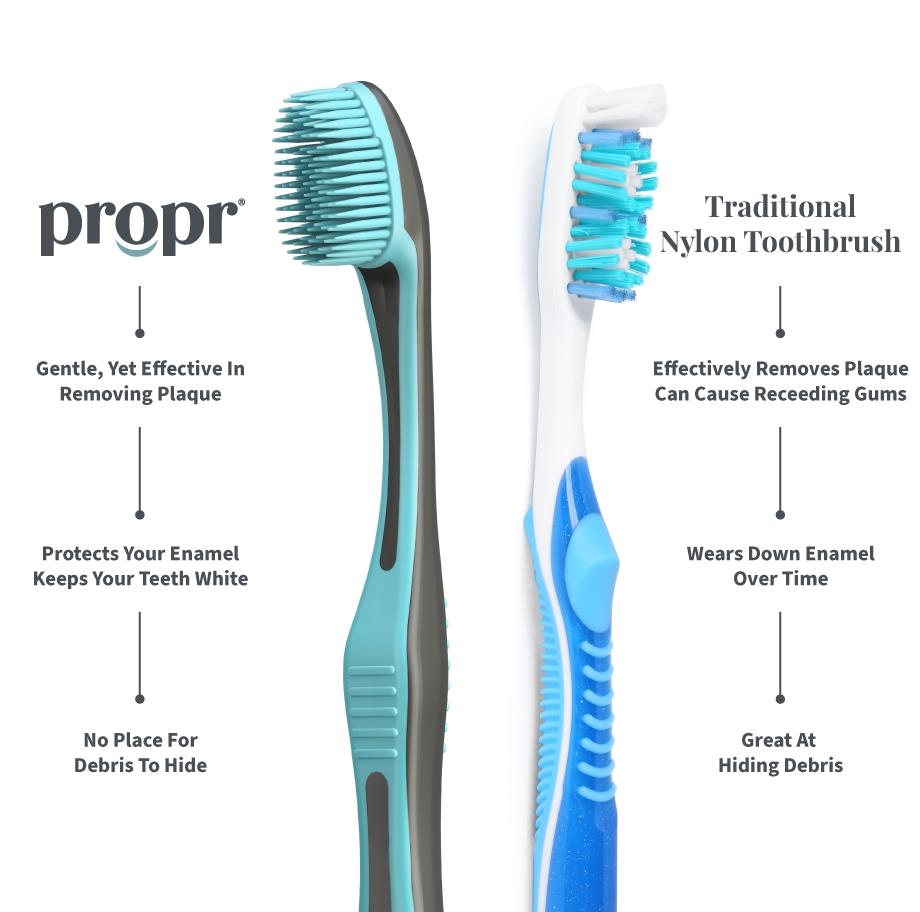 Driven to rethink daily oral hygiene from the ground up, Dr. Gruber began experimenting with alternative materials and brush designs. The result was the Propr Brush, a purpose-built toothbrush that replaces conventional nylon bristles with Medical Grade TPE super-soft scrubbers. Unlike nylon, TPE is flexible, non-abrasive, and engineered to clean effectively while reducing friction and trauma.
