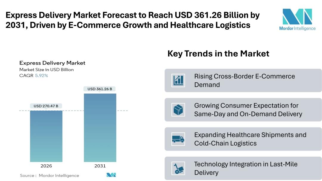 According to Mordor Intelligence, the express delivery market is projected to expand significantly, with its market size expected to grow from USD 270.47 billion in 2026 to USD 361.26 billion by 2031, registering a compound annual growth rate (CAGR) of 5.92%. This growth is fueled by rising cross-border e-commerce, increasing consumer expectations for rapid deliveries, and the expanding demand for healthcare logistics, particularly in temperature-sensitive cold-chain shipments. North America remains the largest market due to established infrastructure and strong demand for premium services, while the Asia-Pacific region is emerging as the fastest-growing market, driven by mobile-first commerce and digital payment adoption.