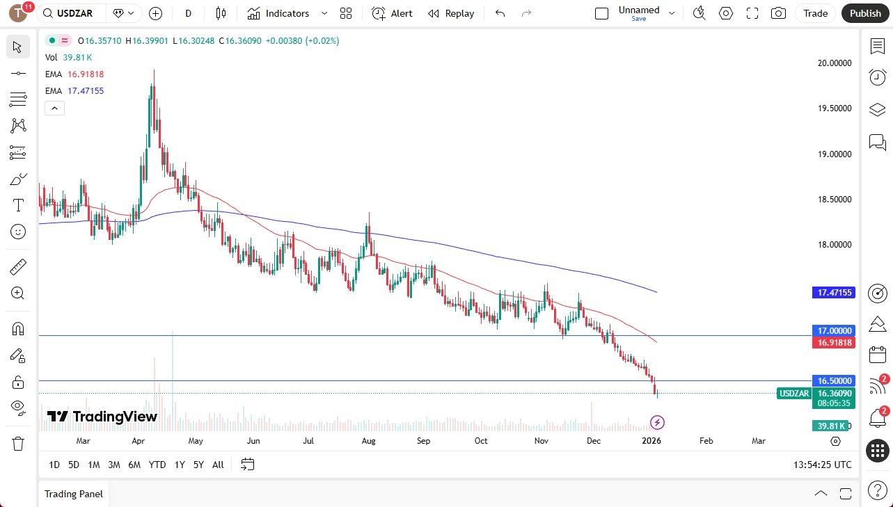 The 16.91 level is massive resistance as well due to the fact that the 50-day EMA has been so closely watched. The fundamental situation is that we have a commodity boom, especially gold, which significantly boosts South Africa's export revenue. The rally is partially driven by safe haven seeking amidst rising geopolitical tensions such as the military action in Venezuela.