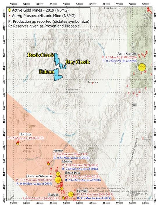 Gold Runner's Tuscarora district play (Rock Creek, Dry Creek, and Falcon) is in a highly prospective, prolific gold region (see Map 2). The properties are surrounded on three sides by sizeable, "world-class" gold deposits and mines, including the Midas mine, approximately 35 km to the west-southwest, which has produced more than 2.2 million ounces Au and 26.9 million ounces Ag with proven and probable reserves of an additional 2.73 million Au and 199.92 million ounces Ag from an epithermal Ag (Au) deposit (Hecla Mining Company Website – 2022); the Goldstrike complex, approximately 40 km south, which produced an incredible 47.8 million ounces Au by the end of 2023 from Carlin-type deposits (Nevada Bureau of Mines and Geology Special Report MI-2023); and the Jerritt Canyon mine, approximately 30 km to the east (further off Carlin Trend than the Tuscarora properties), which has produced 9.7 million ounces Au from a Carlin-type gold deposit (Technical Report on the Jerritt Canyon Mine, Elko County, Nevada, USA Report for NI 43-101 – 2021), with continued exploration ongoing. The information provided herein from neighbouring projects and properties should not be relied upon as indicators for the determination of mineralization or potential results of the Company's properties.
