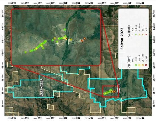The company is currently scheduling extensive, property wide mapping and sampling at Falcon following up on its initial sampling along 900 meters of float and outcrop of the quartz vein that hosts the historic Falcon Mine. This wide vein (up to 40 feet wide) is one of 18 known veins raking north from the Falcon property up to and along the length of the Rock Creek Property. Thirty-nine samples were collected and submitted for geochemical analysis with detectable gold or silver in all but one sample. Four samples had greater than 25 grams per tonne ("gpt") silver, including samples FAL23_36 at 720 gpt Ag and FAL23_37 at 238 gpt Ag. Both of the highest two silver samples were taken from the Falcon mine area, both had elevated gold, arsenic, and antimony, and both had visible sulfides. Five samples had greater than 0.5 gpt gold, including sample FAL23_13 at 1.131 gpt Au.