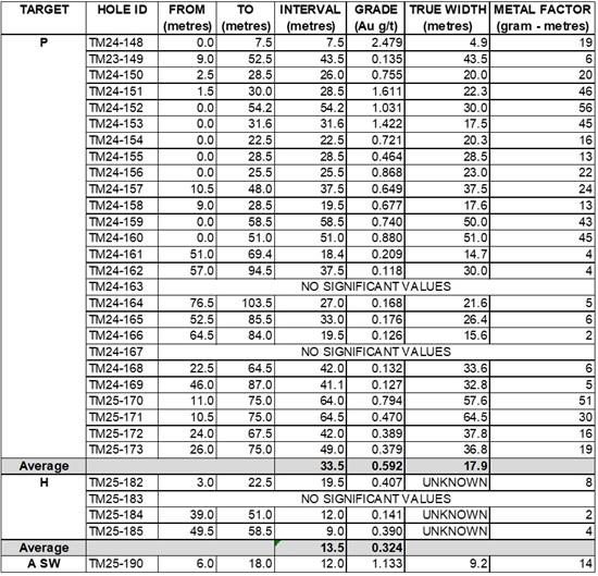 In Q1, 2025 the Company's 2025 Phase One drill program targeted the down-dip continuity of the P-Target and attempted to trace the down plunge continuity to the southeast. The initial holes tracing the down plunge continuity failed to intersect the projected keel of the plunging target which the Company subsequently determined (2025 Phase Two) had a shallower plunge than initial predicted. The down-dip drill holes (TM25-161 to 167) targeted the interpreted down-dip continuation of the mineralization initially intersected in 2024. Two of the seven holes failed to intersect any significant mineralization. The remaining five (5) holes intersected the targeted lithology but the intense alteration observed near surface was absent. As a result, gold grades ranging from 0.10 to 0.20 g/t were returned over similar true widths to that observed in the initial drilling.