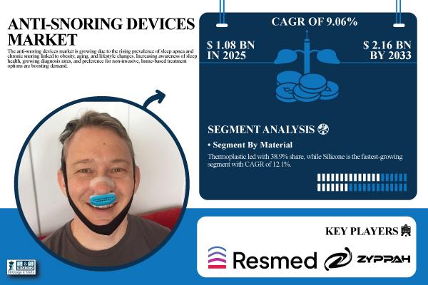 As per SNS Insider, the Anti-snoring Devices Market is estimated to be USD 1.08 billion in 2025E and is projected to grow to USD 2.16 billion by 2033, at a CAGR of 9.06% during the forecast period of 2026-2033. The global anti-snoring devices market is driven by the increasing incidence of chronic snoring and obstructive sleep apnea due to obesity, the aging population, and lifestyle factors. The increasing number of diagnoses, awareness of sleep health, and a strong preference for non-invasive, home-based treatment options are major drivers of the market. Advances in oral appliances and nasal devices, along with comfort and customization, are also fueling the market. Additionally, the growing e-commerce platforms and acceptance of sleep therapy products are also driving the market.