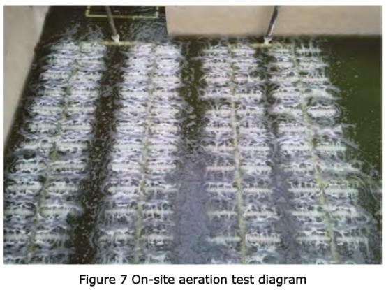After aeration system installation, a 100 kg concentrated load test was performed on the tank bottom air main header under dry conditions. The header showed no bending deformation, simulating potential heavy loads during actual operation to verify its load-bearing capacity and structural stability. After passing the load test, blowers were started, and lateral valves were opened one by one. Soapy water was sprayed on pipe joints to check for leaks. Upon passing this check, clean water was filled into the tank. During filling, diffuser surface heights were observed and adjusted to be level within an error of no more than ±5mm. When the water level exceeded the diffuser pipe centerline by 200mm, water inflow stopped, and aeration commenced for 5-10 minutes to check all pipe joints for leaks. If localized high airflow was observed, it indicated potential pipeline leaks or diffuser damage. Finally, the diffusers were operated at a medium air rate to check for uniform aeration (see Figure 7).
