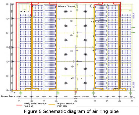 (3) Addition of aeration main header ring pipe. The original design of the biological reaction tank aeration system featured only a single main header with laterals connected in series. This resulted in different pressures at the beginning and end laterals, causing uneven aeration within the tank. Therefore, a stainless steel air ring main header was added to achieve more uniform aeration.
