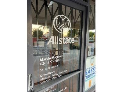 "A close-up view of the glass entrance door to an Allstate Insurance office. The door prominently displays the Allstate logo of cradled hands above the name Marvin Martinez and his phone number, 626-877-0600. Information on the glass indicates that "Se habla español" and lists the office hours as Monday – Friday from 9 am to 6 pm and Saturday from 10 am to 2 pm. Through the reflection on the glass, a parking lot and a tall palm tree can be seen under a clear sky."Marvin Martinez: Allstate Insurance provides auto insurance agent services and seguro de hogar to El Monte residents with bilingual support, local expertise, and comprehensive coverage options for vehicles and property.