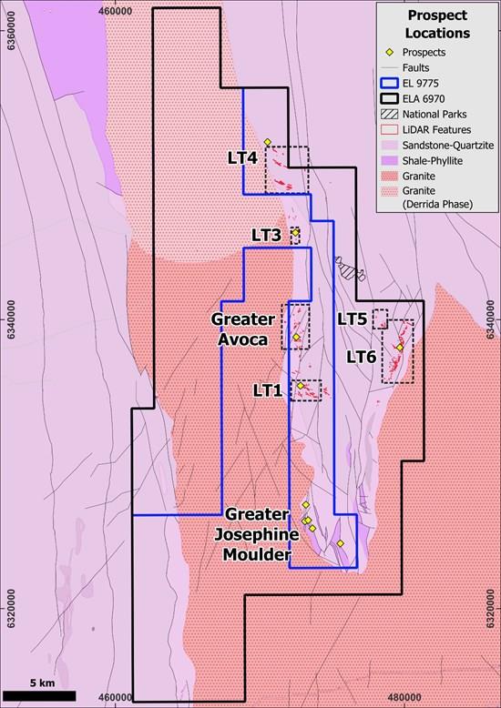 Extensive Strike Length: 75km of prospective granite-sedimentary contact strike length within Lancaster's tenure, which is largely unexplored, with recent field work undertaken at the Greater Josephine Moulder, Greater Avoca, and LiDAR Targets 1-4 ( LT1-4 ). Multiple Vein Systems: Extensive areas of newly mapped veins at the Greater Avoca and Josephine Moulder North prospects, where limited historical rock-chip sampling returned up to 3.66 g/t Au and 1.6 g/t Au respectively1 as well as encouraging geological observations from the accessible portions of LT1.