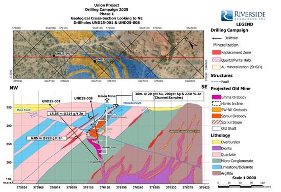 The Union Mine cross section ( Figure 1 ) shows holes 1 and 8 along with the gold-rich channel sampling results, providing context for the 30 m gold-silver-zinc interval relative to some of the known ore bodies. Areas for follow-up and expansion at Union Mine area are clearly indicated to the right (southeast) in Figure 1 as the 2025 drilling has helped define the stratigraphy and highlighted areas of SHGD styles of mineralization similar to eastern Nevada. The bottom of hole 8 hit strong indications of CRD mineralization prior to intersecting the mine workings, as well as manto horizons along the drill hole with 15.85m @ 214 ppm Zn in dolomitized limestone. Drill hole 7, drilled north of holes 1 and 8 and the cross section hit 14m @ 0.1% Zn in the Union Mine area as well.