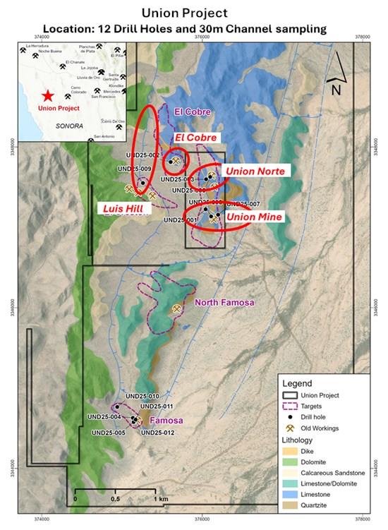 The location of all 12 drill holes from the 2025 Phase I programs are shown in the drill plan ( Figure 3 ), with the channel sampling area and the Union Mine, Union Norte and El Cobre target areas highlighted.