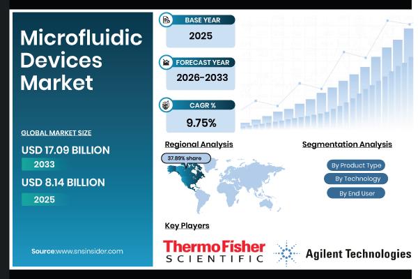 Austin, Texas, Jan. 23, 2026 (GLOBE NEWSWIRE) -- As per SNS Insider, the Microfluidic Devices Market was valued at USD 8.14 billion in 2025 and is expected to reach USD 17.09 billion by 2033, growing at a compound annual growth rate (CAGR) of 9.75% during the forecast period of 2026-2033. The Market is growing at a rapid pace due to the increasing adoption of advanced technologies by the healthcare and life sciences industry.
