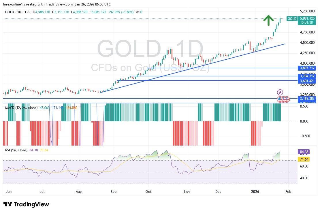 EURUSD Chart by TradingViewWill Gold Prices Rise in the Coming Days?According to gold analysts and disregarding recent gains in the gold market and the fact that all technical indicators have reached strong overbought levels, the price of gold is expected to surpass the $5,000 per ounce mark, a significant psychological level. This surge is driven by the weakening US dollar and bolstered by geopolitical concerns.Experts and analysts believe that the upward movement following the breakout of the flag pattern is nearing its end. This pattern, a technical analysis indicator that follows a sharp market move, suggests the continuation of the trend. They add that, barring any new geopolitical conflicts, gold may experience some consolidation after the breakout, as it tends to stabilize around key levels.This pattern last occurred around the $2,000 per ounce level, around which gold remained stable for most of 2020-2023. Overall, commodity market experts continue to monitor geopolitical hotspots such as Venezuela, Iran, and Greenland Tips:Dear TradersUp trader, we recommend continuously monitoring the drivers of the gold market rally to anticipate further gains or potential exposure to profit-taking selloffs. Generally, utilize any Gold pullbacks as an opportunity to look for new buying entries.Ready to trade today's Gold prediction? Here's a list of some of the best XAU/USD brokers to check out.