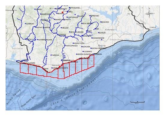In country production is derived from multiple onshore gold belts that are intersected and drained by several major river systems transporting eroded gold-bearing sediments (bedload) to the coast. Within the License Area, the major river systems, draining gold belts in southwestern Ghana, converge onto a shallow continental shelf. Over prolonged interglacial periods, repeated erosion, sea-level fluctuations, and sediment transport are believed to have delivered and reworked gold-bearing bedload into offshore paleo-channels, submerged beach systems, and deltaic environments.[2]