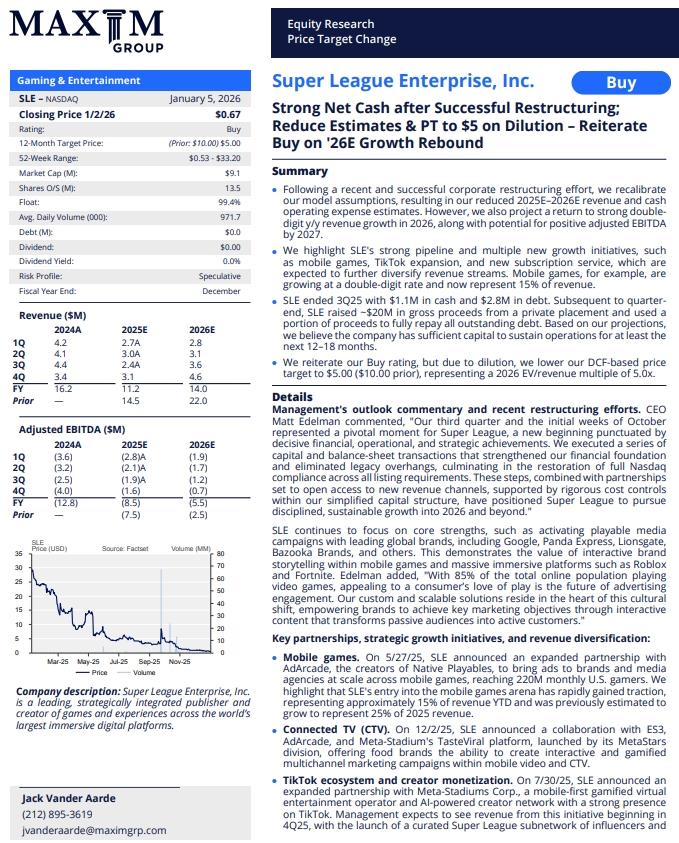 On January 6th SLE announced the appointment of investment banking veteran Marti Frucci to its Board of Directors. Additionally, Chief Executive Officer Matt Edelman assumed the role of SLE Chairman of the Board, effective January 1, 2026.