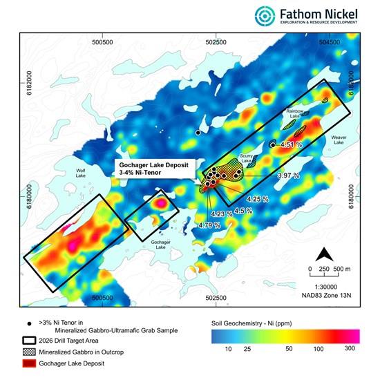 Ian Fraser, Fathom CEO and VP Exploration stated, "We are very much looking forward to the next phase of drilling at our Gochager Lake project. The surface work performed in 2024/2025 has significantly expanded the geological and geochemical footprint of the historic Gochager Lake deposit along strike northeast and southwest. Our exploration priority at Gochager was first to understand the geologic setting of the historic deposit and then work on building "scale". The expanded geological footprint, specifically, mineralized variable-texture gabbro occurring up to 3.5km northeast of the historic deposit is very encouraging. Additionally, we look forward to testing areas of very robust multi-element soil geochemical anomalies to determine the underlying geology. All drillholes will be probed with borehole electromagnetic (BHEM) surveys, an exercise that has proven to be very successful within the historic deposit area."
