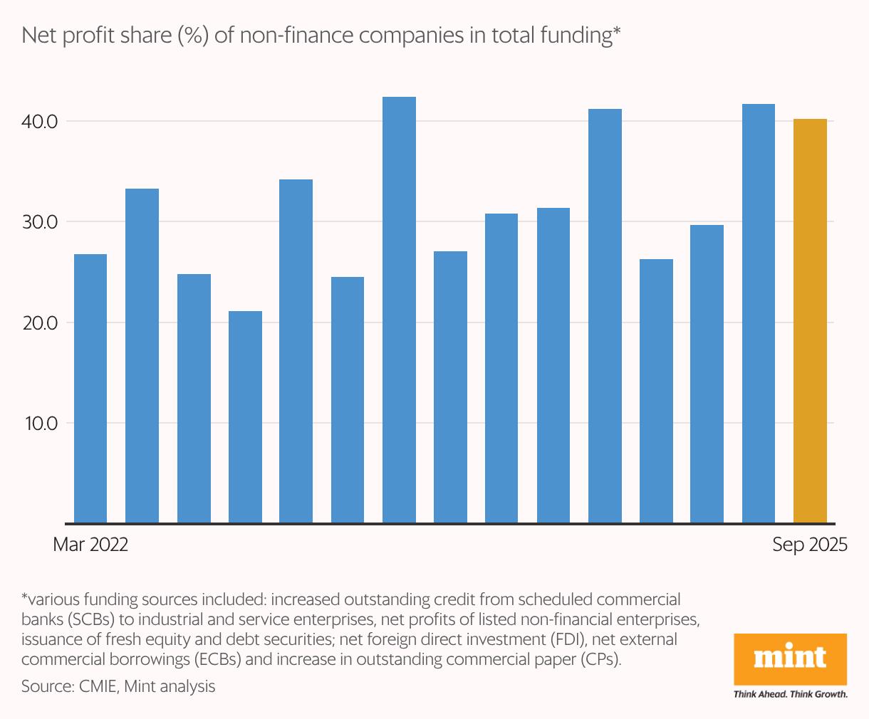 Also Read | Economic Survey calls for multi-pronged push to sustain Profit powerA separate Mint analysis of CMIE data revealed that net profits-or internal accruals-remain the primary funding source for Indian corporates. In the September quarter, non-financial companies recorded a massive ₹3 trillion in net profits, accounting for nearly 40% of all funds raised. This 54.5% year-on-year surge marked the strongest profit growth in four years.