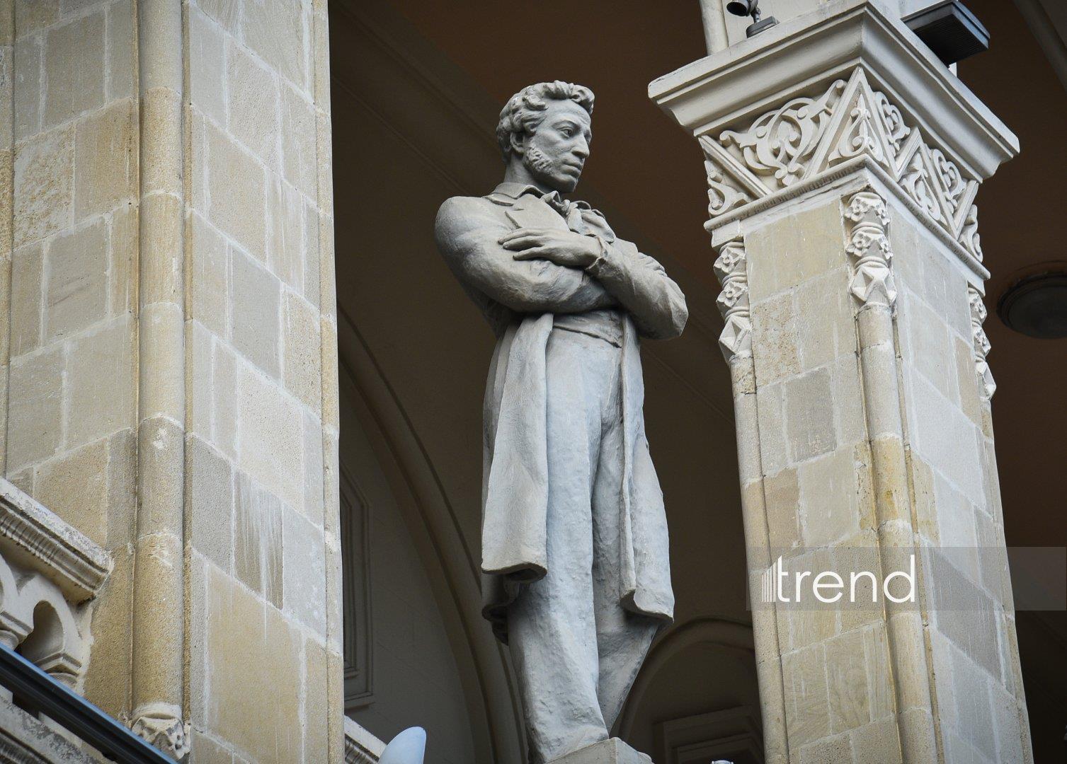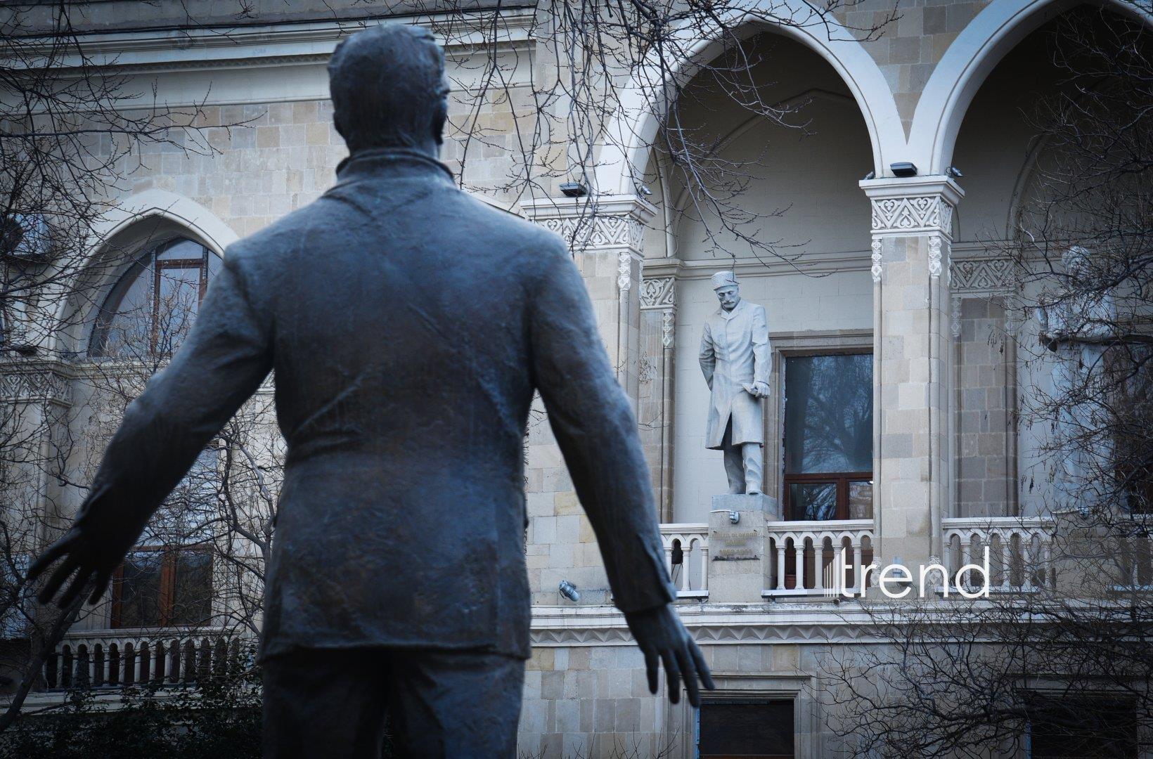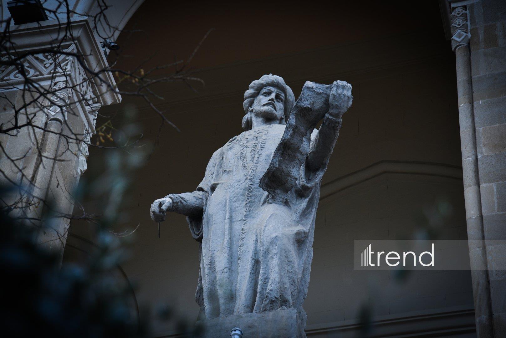 Precisely, the library facades became not only an architectural but also an artistic manifesto of the epoch. On the large terrace, in the loggias of the facades, 15 statues of outstanding representatives of Azerbaijani and world culture are installed. From left to right, they are arranged in the following order: