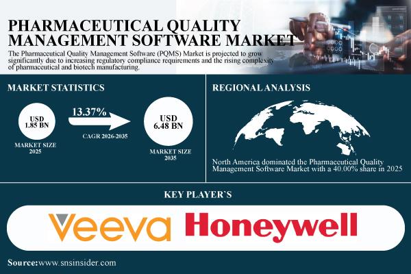 According to SNS Insider, The Pharmaceutical Quality Management Software Market is valued at USD 1.85 billion in 2025 and is expected to reach USD 6.48 billion by 2035, growing at a CAGR of 13.37% over 2026-2035. Owing to the growing complexity of pharmaceutical and biotech manufacturing as well as the growing regulatory compliance requirements, the pharmaceutical quality management software (PQMS) market is expected to increase dramatically.