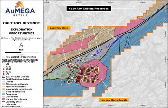 Figure 2: Cape Ray District illustrating the 2023 mineral resource areas and the Cape Ray West 2025 surficial geochemical results 6 .