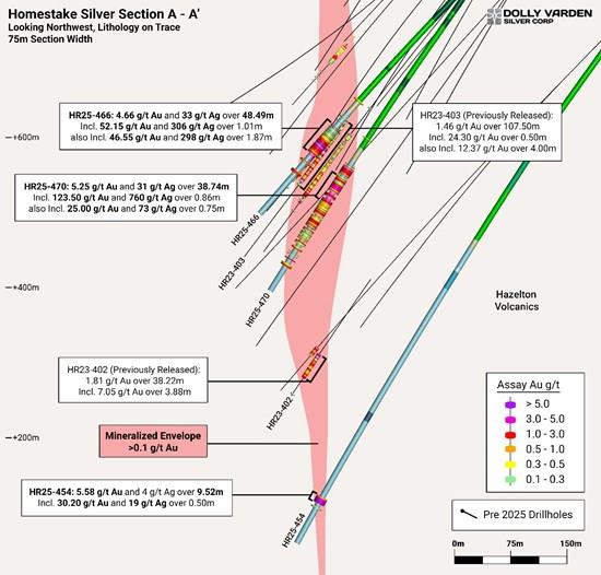 Figure 4. Cross section including drill hole HR25-466 and HR25-470 located within the high-grade northerly plunging zone, and drill hole HR25-454 a 200 m down-dip step-out (405 meters below HR25-470) on the Homestake Silver structurally controlled mineralized zone shown in red.