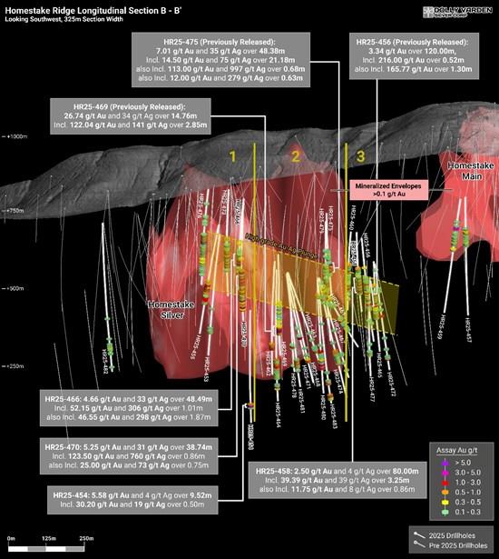 Figure 1. Longitudinal Section of the Homestake Silver Deposit with mineralization envelope in red. Shallow northerly plunging trend of broad mineralization with multiple narrower high grade gold veins and vein breccias within shown in yellow. Three-part 2025 drill program split between 1) southern silver-rich zone infill, 2) central main infill and expansion, 3) expansion through northern and down dip step-outs. For previously released detail: HR25-456 on October 1, 2025, HR25-469 on November 10, 2025, HR25-475 on December 04, 2025.