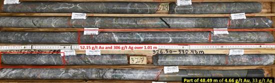 | | including | 325.77 | 326.78 | 1.01 | 52.15 | 306 | Plus 3.03% Pb, 5.14% Zn |