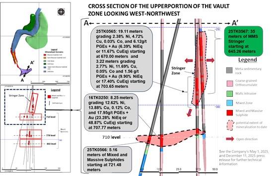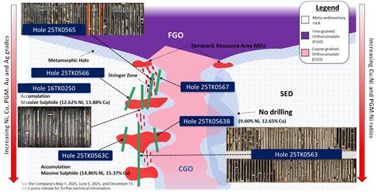 As outlined in the Company's December 11, 2025 press release, drill hole 25TK0565, located 103 meters below drill hole 12TK0153C (see the November 2022 Technical Report for further details on drill hole 12TK0153C) within the Tamarack Resource Area, intercepted 19.11 meters of MMS grading 6.39% NiEq (11.67% CuEq) starting at 670.00 meters, and 3.22 meters grading 9.90% NiEq (17.40% CuEq) starting at 703.65 meters (see Figure 3).