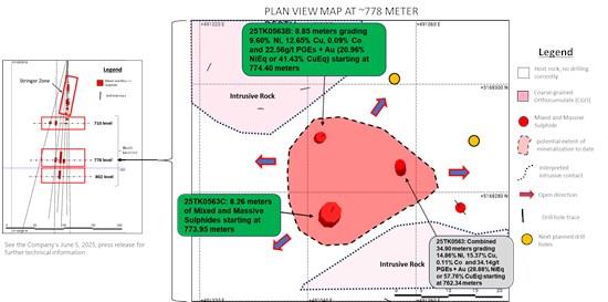 New drill hole 25TK0563C (see Figure 2) intercepted 8.26 meters of MMS and MSU mineralization starting at 773.95 meters. This intercept, located 15 meters south of drill hole 25TK0563B, represents a 16-meter step-out to the southwest of the upper part of discovery drill hole 25TK0563. Mineralization remains open in all directions, and additional drill holes are planned to the north and to the east of drill hole 25TK0563 (see Figure 5).