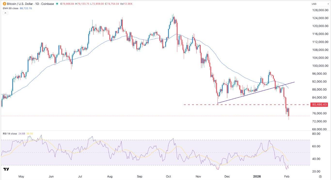 EURUSD Chart by TradingViewBTC/USD Technical AnalysisThe daily timeframe chart shows that the BTC price has been in a strong downward trend in the past few months. It made a strong bearish breakdown recently when it crashed below the lower side of the bearish flag pattern.The coin has remained below the oversold level of 30. At the same time, the Relative Strength Index (RSI) and other oscillators have moved to the oversold level.It also moved below the key support level at 80,485, its lowest level in November last year. The coin also dropped below the key support level at 74,500, its lowest level in April last year.Therefore, the most likely scenario is where the BTC/USD pair continues falling as sellers target the next key support level at 70,000.On the positive side, the coin has become highly oversold, meaning that it may have a relief rally in the coming weeks.Ready to trade our free Forex signals? Here are the best MT4 crypto brokers to choose from.