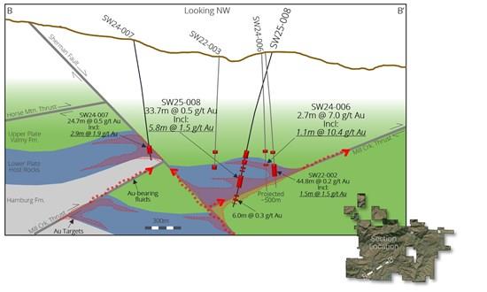 SW25-008 was designed to test along strike of high-grade gold intersected in SW24-006 at the projected intersection of a north-south trending fault corridor with the southwest projection of the Mill Creek thrust fault.