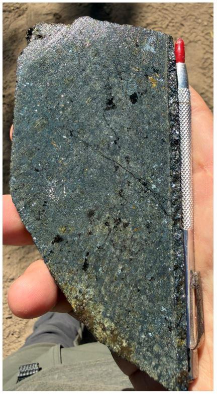 Figure 6. Skarn horizon 4 - Green-garnet skarn with copper and silver sulfides (note the skarn front in the axis of the core sample).