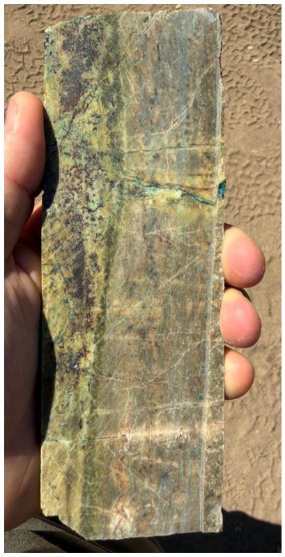 The first new horizon (339.10m - 348.65m), returned 9.55m @ 1.4% Cu, 0.4 g/t Au, 41.8 g/t Ag (figure 5). This interval is characterized by fine grained green garnet skarn, with abundant magnetite and strong copper sulfide development, including chalcocite and chalcopyrite, locally accompanied by silver-rich sulfides.